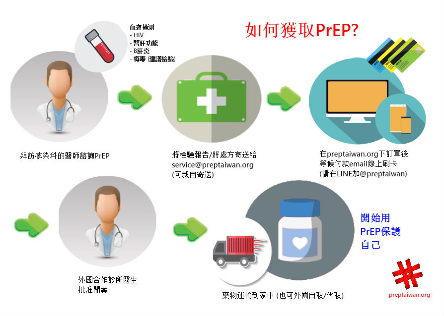 請您和醫院預約掛號、向醫生諮詢有關 PrEP 的使用方式和完成檢查,並要求開立處方籤已便符合 PrEP 個人自用申請資格 - 掛號前請與我們聯繫: